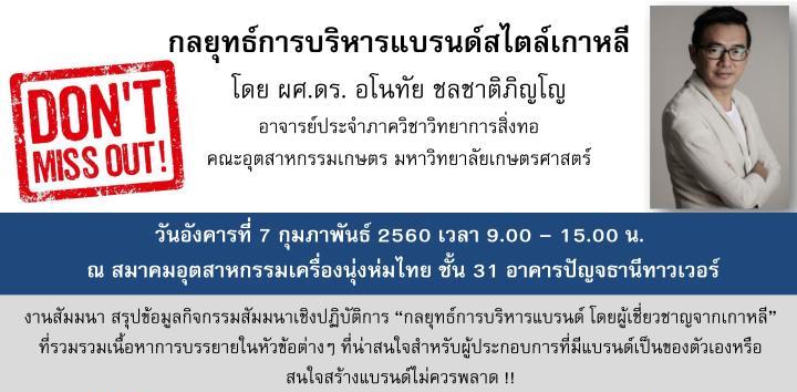 ผู้ประกอบการที่มีแบรนด์ของตัวเองหรือสนใจสร้างแบรนด์ไม่ควรพลาด สัมมนา “กลยุทธ์การบริหารแบรนด์สไตล์เกาหลี” โดย ผศ.ดร. อโนทัย ชลชาติภิญโญ วันอังคารที่ 7 กุมภาพันธ์ 2560 เวลา 9.00 – 15.00 น. ณ สมาคมอุตสาหกรรมเครื่องนุ่งห่มไทย ชั้น 31 อาคารปัญจธานีทาวเวอร์