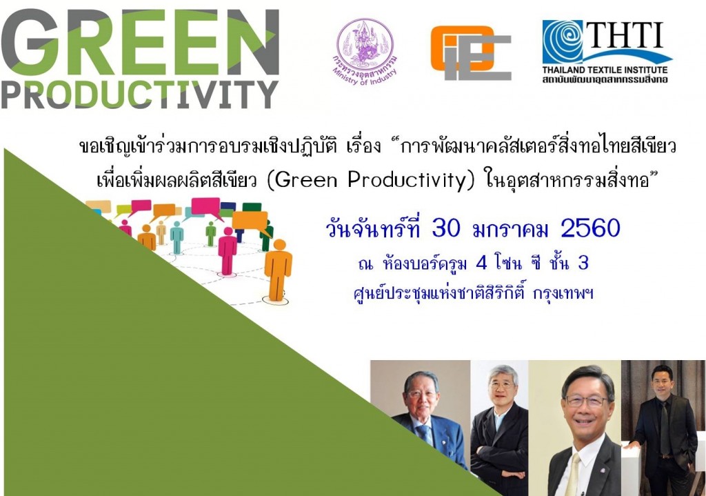 ขอเชิญผู้ประกอบการสิ่งทอเข้าร่วมการฝึกอบรมเชิงปฏิบัติการ (Workshop) “การพัฒนาคลัสเตอร์สิ่งทอไทยสีเขียว เพื่อเพิ่มผลผลิตสีเขียว (Green Productivity) ในอุตสาหกรรมสิ่งทอ” วันจันทร์ที่ 30 มกราคม 2560 ณ ห้องบอร์ดรูม 4 โซน ซี ชั้น 3 ศูนย์การประชุมแห่งชาติสิริกิติ์ กรุงเทพฯ